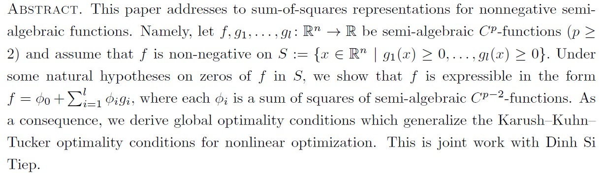 Bio: Tien-Son Pham,越南Dalat University教授,博士生导师,长期从事奇异理论、半代数优化、变分分析等研究工作,在Mathematical Programming, SIAM Journal on Optimization, Mathematics of Operations Research等优化顶级期刊发表学术论文70余篇,出版学术专著1部。2020年获越南科技部颁发的Ta Quang Buu奖,并入选2021年度“亚洲百位杰出科学家”榜单(该榜单由亚洲科学家杂志自2016年起每年评选,表彰在科研领域取得重大突破或获得国家级/国际奖项的科学家)。现任越南高等数学研究所科学理事会(Scientific Council)成员。